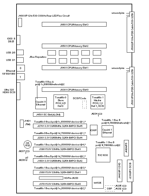 - Master Tomatillo interfaces include the ALOM Slot, Ethernet 1, Flash PROM,