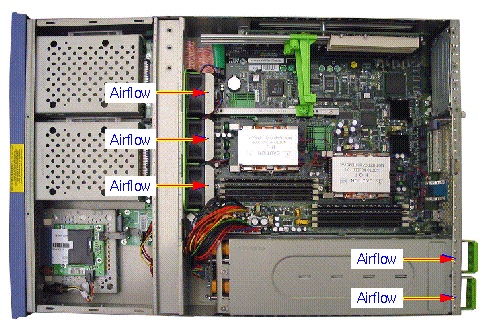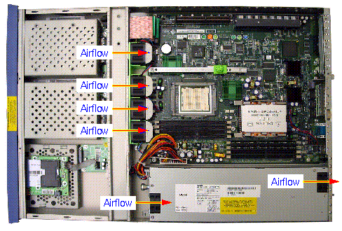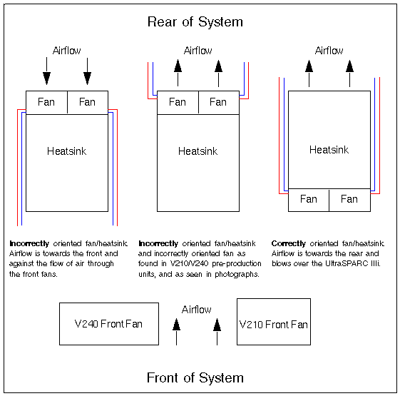 System Airflow and CPU Fan/Heatsink OrientationThe CPU Fan/Heatsinks in these photos are incorrectly installed.Fans are incorrectly installed with the exhaust side facing away from the heatsink. Correct installation would position the fans towards the front of the system with the exhaust side facing the heatsink(s). Sun Fire V210 Pre-Production Unit (photographed in 2003)