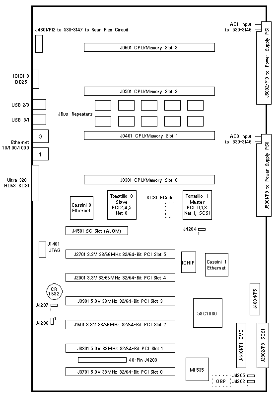 Flash PROM, I2C, ATA-100, PCI Slots 0, 1, and 3, SCSI, Serial B,
