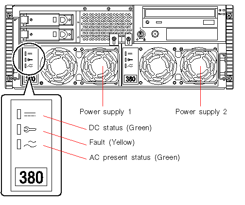 Power Supply LEDsPower supply LEDs are visible from the front of the system with the doors open. The following figure shows the LEDs on the power supply in bay 0. The following table provides a description of each LED.