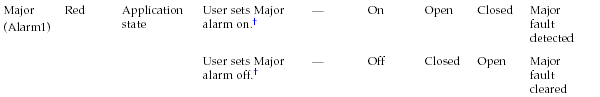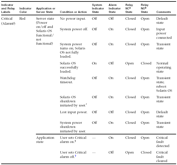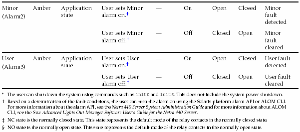 The dry contact alarm card has four LED status indicators that are supported by ALOM. Information about the alarm indicators and dry contact alarm states is provided in the following table. For more information about alarm indicators, refer to the Sun Advanced Lights Out Manager Software User's Guide for the Netra 440 Server (817-5481). For more information about an API to control the alarm indicators, refer to the Netra 440 Server System Administration Guide (817-3884).