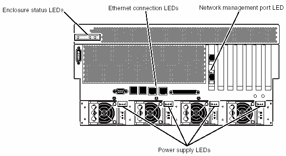console: Back Panel LEDsThe back panel LEDs include the enclosure status LEDs, the Ethernet port LEDs, the power supply LEDs, and the Network management port LED. The enclosure status LEDs are replicated from the front panel.