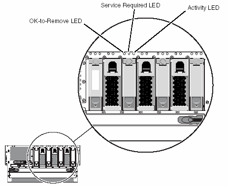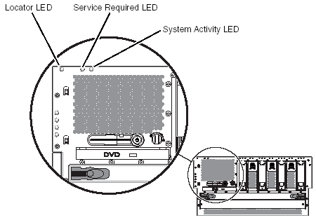 Netra 440 LEDsFront Panel LEDsSeveral front panel LEDs provide general system status, alert you to system problems, and help you to determine the location of system faults. During system startup, the LEDs are toggled on and off to verify that each one is working correctly. LEDs located on the front panel work in conjunction with specific fault LEDs. For example, a fault in the power supply subsystem illuminates the power supply Service Required LED on the affected power supply, as well as the system Service Required LED. Since all front panel status LEDs are powered by the system's standby power source, fault LEDs remain lit for any fault condition that results in a system shutdown. Enclosure Status LEDsAt the top left of the system as you look at its front are three enclosure status LEDs. The System Activity LED and the system Service Required LED provide a snapshot of the overall enclosure status. The Locator LED helps you to quickly locate a specific system even though it may be one of numerous systems in a room. The Locator LED is at the far left in the cluster, and is lit by command from the administrator. Each enclosure status LED has a corresponding LED on the back panel.