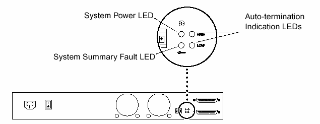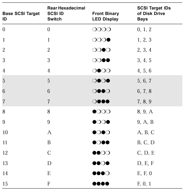 Note: If a disk drive is under an unusually heavy load (for example, if the drive is being reformatted), the Disk Drive LED might be unlit for a long period of time, even though the drive has not failed. You should see a message in your console window telling you that the disk drive is offline if the disk drive has truly failed. Binary SCSI ID LEDsThe disk drive SCSI ID numbers are assigned in sequences of three numbers in a row. The first number in the sequence is the base address. The base address is the number used to set the SCSI toggle switch on the back of the storage enclosure and is represented in binary format on the top row of disk drive LEDs on the front of the storage enclosure. Note: The shaded rows of the table represent SCSI ID sequences that cannot be used because SCSI ID 7 is assigned to the SCSI controller. Some servers reserve SCSI ID 6 for use by CD drives and IDs 0 and 1 for internal drives. Rear Panel LEDsSystem Power and System Summary Fault LEDsThe System Power and System Summary Fault LEDs give the same diagnostic information as the System Power and System Summary Fault LEDs at the front of the enclosure. Auto-termination Indication LEDsThe Auto-termination Indication LEDs indicate if the StorEdge S1 storage enclosure is part of an UltraSCSI, wide SCSI, or narrow SCSI daisy-chain. They also indicate the enclosure's position in the daisy-chain.