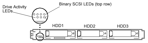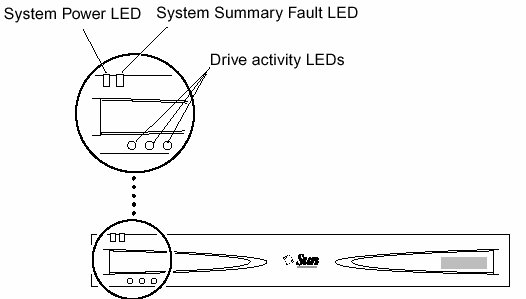 Sun StorEdge[tm] S1 LEDsFront Panel LEDsThe front panel LEDs indicate system power, system faults, hard drive activity, and SCSI ID assignments. There is also a quick-reference card attached to the system which explains what the SCSI ID LEDs mean. With BezelWithout Bezel