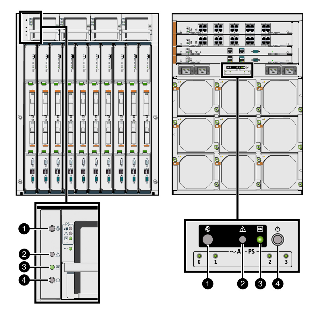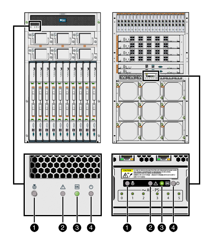 indicators on all replaceable components (FRUs and CRUs), front and rear, to light as long as the Locator button is pressed. Once the Locator button is released, all component