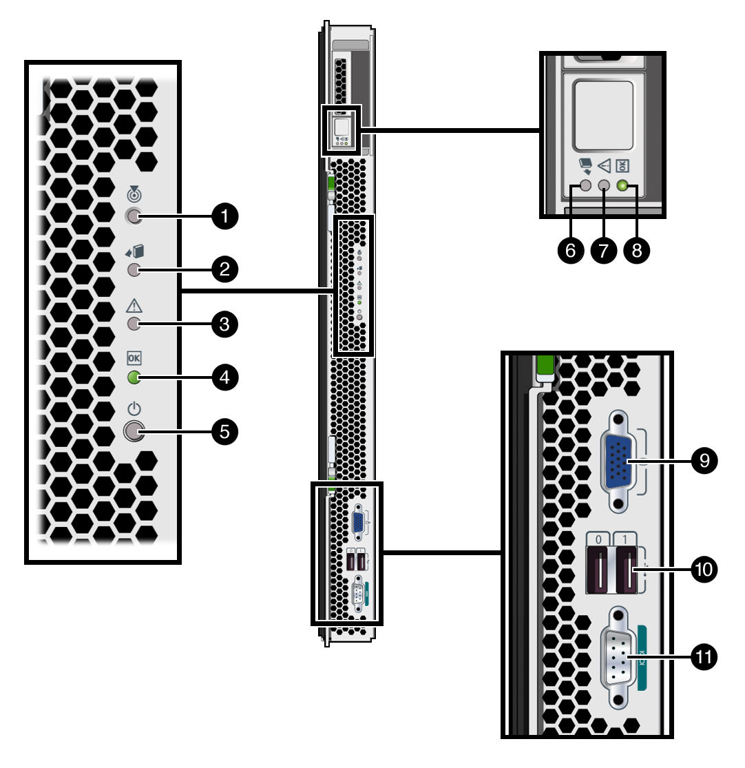 The Network Express Modules (NEMs) and PCI Express ExpressModules (EMs; Sun Blade 8000 Chassis only) provide a standard set of status indicators, buttons, and Ethernet