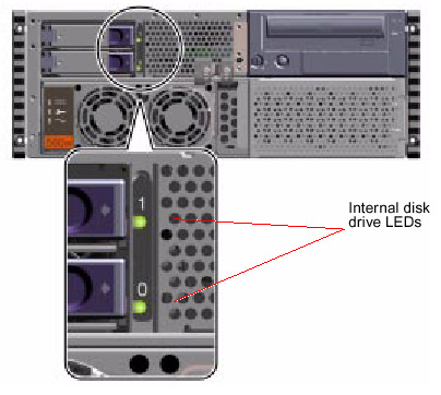The disk LEDs are visible from the front of the system when the left door