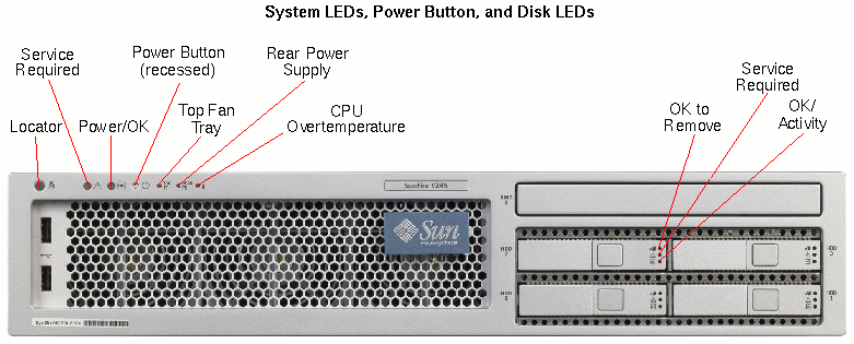 The left front of the Sun Fire V245 server contains six LED status indicators and a power button.