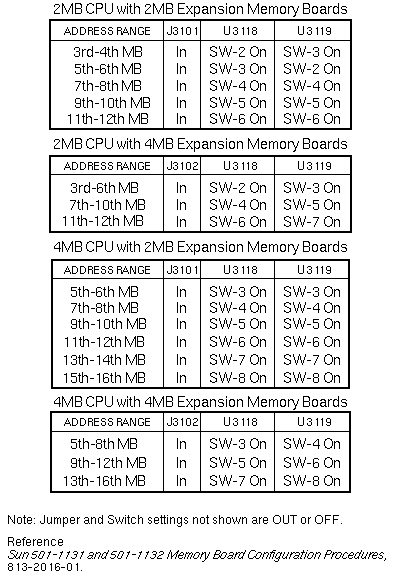 Volume I: MemorySun-3/75501-1111 [2MB Parity]501-1121 [0MB Parity] 501-1122 [4MB Parity] Sun-3/110/140/150/160/180501-1131 [2MB Parity]501-1132 [4MB Parity] 501-1111 / 501-1121 / 501-1122 / 501-1131 / 501-1132 Jumper Settings | ||||||||||||