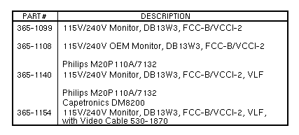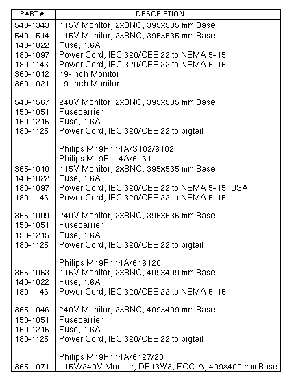 Volume II: Parts Breakdown - Monitor19-inch Greyscale CRTImage Size: 350 mm Horizontal / 273 mm Vertical / 443 mm DiagonalPixel Horizontal Vertical Resolution Frequency Frequency ---------- ---------- --------- 1152 x 900 61.8KHz 66Hz 19-inch Greyscale CRTImage Size: 350 mm Horizontal / 273 mm Vertical / 443 mm DiagonalPixel Horizontal Vertical Resolution Frequency Frequency ---------- ---------- --------- 1152 x 900 71.7KHz 76Hz 1076 x 824 71.7KHz 76Hz | ||||||||||||