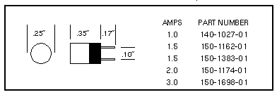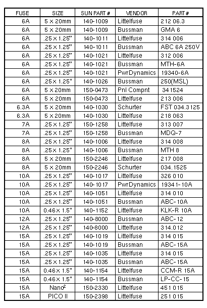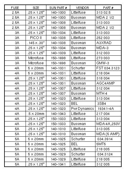 Subminiature microfuses are used on many Sun Printed Circuit Boards. Subminiature microfuses are field replaceable. PICO II fuses are used on Printed Circuit Boards and Peripheral devices such as Tape and Disk Drives. PICO II fuses are not field replaceable because they are soldered in place. Positive Temperature Coefficient (PTC) thermistors are resistors with a high positive temperature coefficient of resistance. The PTC is used as a self-resetting fuse in overload applications. When an overload current flows through a PTC, there is a specific time period before the PTC heats up to its high-resistance state and starts limiting the current. PTCs are not field replaceable because | ||||||||||||