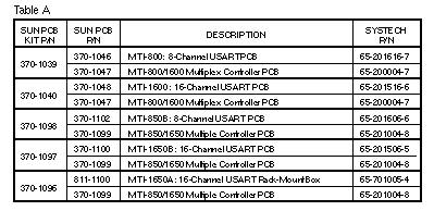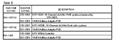 Table A identifies the ALM boards in a Sun PCB kit. Columns 2,
