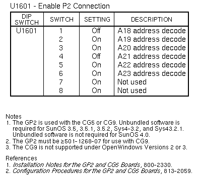 Volume I: Video/GraphicsGP2 Graphics ProcessorSun-3/150/160/180/260/280/460/470/480Sun-4/150/260/280/330/350/360/370/380 Sun-4/390/470/490 501-1268 501-1268 Switch Settings | ||||||||||||