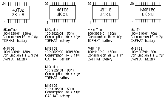 IDPROMs, NVRAMs, and EEPROMs are not interchangeable. Programmed components that have a unique machine type are not interchangeable. For example, a new NVRAM is required when an SS2 (55xxxxxx) is upgraded to an SS20 (72xxxxxx). Different component types are not interchangeable between systems. For example, a new NVRAM is required when an SS4 is upgraded (48T08) to an Ultra 1 Model 140 (48T59). The 48T08 and 48T18 have the same pin count as the 48T59 but they are not pin compatible with the 48T59. The NVRAM also contains a Time of Day clock. Accuracy of the clock is typically +/- 1 minute per month at 25°C. The 32,768Hz oscillator is tested not to exceed +/- 1.53 minutes per month (35PPM) error rate at 25°C. NVRAM Component Types