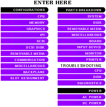 ![]() [ Configurations ] [ CPU ] [ Memory ] [ Graphics ] [ IPI ] [ SCSI ] [ SCSI Disk ] [ Removable Media ] [ Communication ] [ Miscellaneous ] [ Backplane ] [ Slot Assignment ] [ Parts Introduction ] [ System ] [ Disk Options ] [ Removable Media Options ] [ Miscellaneous Options ] [ Board ] [ Input Device ] [ Monitor ] [ Printer ] [ CPU Trouble ] [ Disk Trouble ] [ Diagnostics ] [ Power Introduction ] [ AC Power ] [ DC Power ]