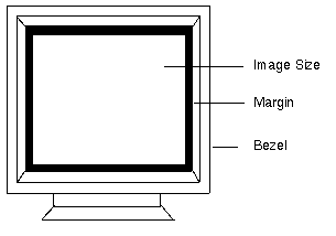 Monitor and Image SizeMonitor size is the diagonal dimension of the CRT or the diagonal dimension of the CRT phosphor coating. The image size of monitors may not be reflected in the monitor size listed in sales documents or price lists. Image size is the horizontal and vertical dimension of the active display. The image size, or active display, is smaller than the CRT, Bezel, and Margin. Sun Monitor Engineering Specifications define the horizontal and vertical dimensions of the image size shown in this section. The diagonal dimensions shown in this section are calculated from the horizontal and vertical dimensions and do not take into account CRT curvature. The dimensions of the 19" Premium Color CRT are: