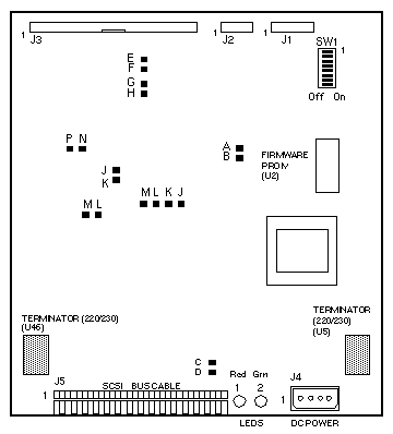 * Jumpers A-B, C-D, and E-F are on the Emulex Rev. MW0210402 board. They are not on Rev. MT0210403 and MT0210103 boards. SW1, Switch 5 and Switch 6, control drive selection on the MT0210403 and MT0210203 boards.