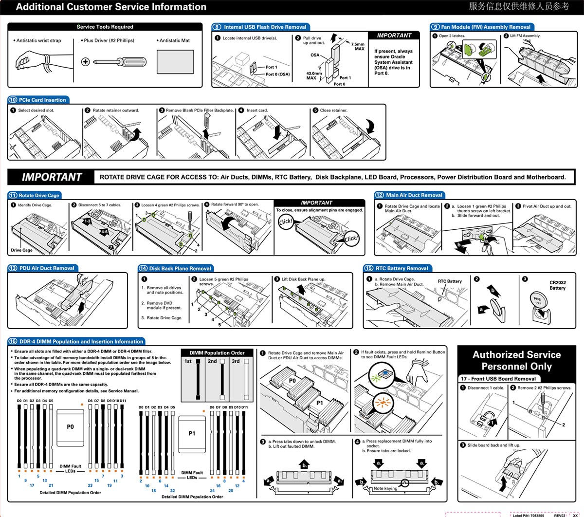 Netra Server X5-2 - Internal Service Label - Internal USB Flash Drive, Fan Module Assembly, PCIe Cards (1-6), Drive Cage, Air Ducts, Disk Backplane and RTC Battery Service Information