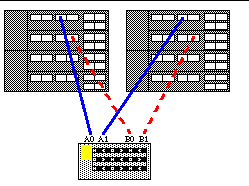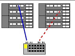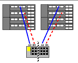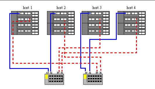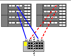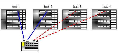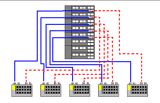 ![]() 1). Single Host, single loop![]() This is the most basic way to connect the A5000. Only a single path is provided. It is recommended to utilize multiple pathing, but this config can be used for direct replacement of singly connect SSAs. 2). Single Host, single HBA, dual loop![]() This example adds a second loop by dual porting the single adapter. This single adapter configuration looses the fault tolerance and performance of a dual adapter config, but is a lower cost option. 3). Single Host, dual HBA, dual loop (Recommeneded)![]() This is the recommended single host configuration. This adds both performance and redundancy to the single loop or single adapter configurations above. 4). Single Host, dual HBA, split loop![]() This is the minimum split loop configuration with only one path to the disks. This would be a good config for a single array server when the data is mirrored from the front disks to rear disks. 5). Single Host, dual HBA, dual path, split loop![]() This is an improved split loop config with the added redundancy of dual paths which eliminates a single point of failure. 6). Single Host, four HBA, dual path, split loop![]() This is the optimal single host split loop config because it delivers both the highest fault tolerance and performance by utilizing all 4 loops on 4 separate HBAs and sbuses. 7). Dual Host, single loop![]() This is the most basic two host configuration. This is a direct replacement for a dual-hosted SSA config. As there are no redundant paths this is not the recommended config, although redundancy could be acheived by mirroring across arrays Note: That the two hosts use two physical loops. For clustering applications this is important since a single loop failure could bring the entire cluster down if both hosts were connected to the same loop. 8). Dual Host, dual HBA, dual path (Recommended)![]() This is the recommended two host configuration. Each host has redundant paths to all devices. Shown is preferred manner of connecting where each path is to a different adapter on a different I/O card. Note: This dual path config is not currently supported with cluster software. 9). Dual Host, dual HBA, split loop shared![]() Both hosts can access all disks. This allows two hosts to share an array utilizing 4 loops. Each host has private use of 2 loops. This may be done for performance reasons. This config only provides a single path to each disk. 10). Dual Host, dual HBA, split loop private![]() Each host sees only half the disks or one backplane. This config is for box sharing where each host has private and exclusive access to half the array disks. This is useful to guarantee that the hosts do not interfer with each others disks. This is a fully redundant config. 11). Three and Four Host, single path![]() This single path configuration is currently the only way to support 3 and 4 host configs. This is sufficient to support clustering as the Clustering Software doesn't currently support dual pathing. Lack of A5000 ports, lack of HUB ports and technical drive issues all combine to make dual path configurations non-feasible at this time for more than 2 hosts. The above config shows four hosts however the removal of host 4 and its connection will create a 3 host config. Note: With a 3 host config one of the hosts could be dual pathed. 12). Three and Four Hosts, single path, dual array![]() Redundancy can be added to the 3 and 4 host configurations by mirroring across arrays. This configuration is the basic building block for a four node cluster. 13). RAID5 RAS Configuration![]() This is the most optimal RAID5 Reliability Availability Serviceability (RAS) hardware configuration possible. Configure the RAID5 volumes so that one disk in each array is used. This gives both very high fault tolerance in that even the failure of an entire array will not cause loss of data. Plus this config can utilize the full bandwidth of 10 loops giving the highest possible throughput of 1000MB/s. This configuration can only be implemented with a host based raid software package. | ||||||||||||